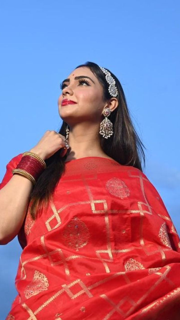 Banerjii looked ravishing in a red saree featuring golden work, teamed with a matching blouse. She complemented the outfit with statement earrings, a studded headband and red bindi and lip shade.