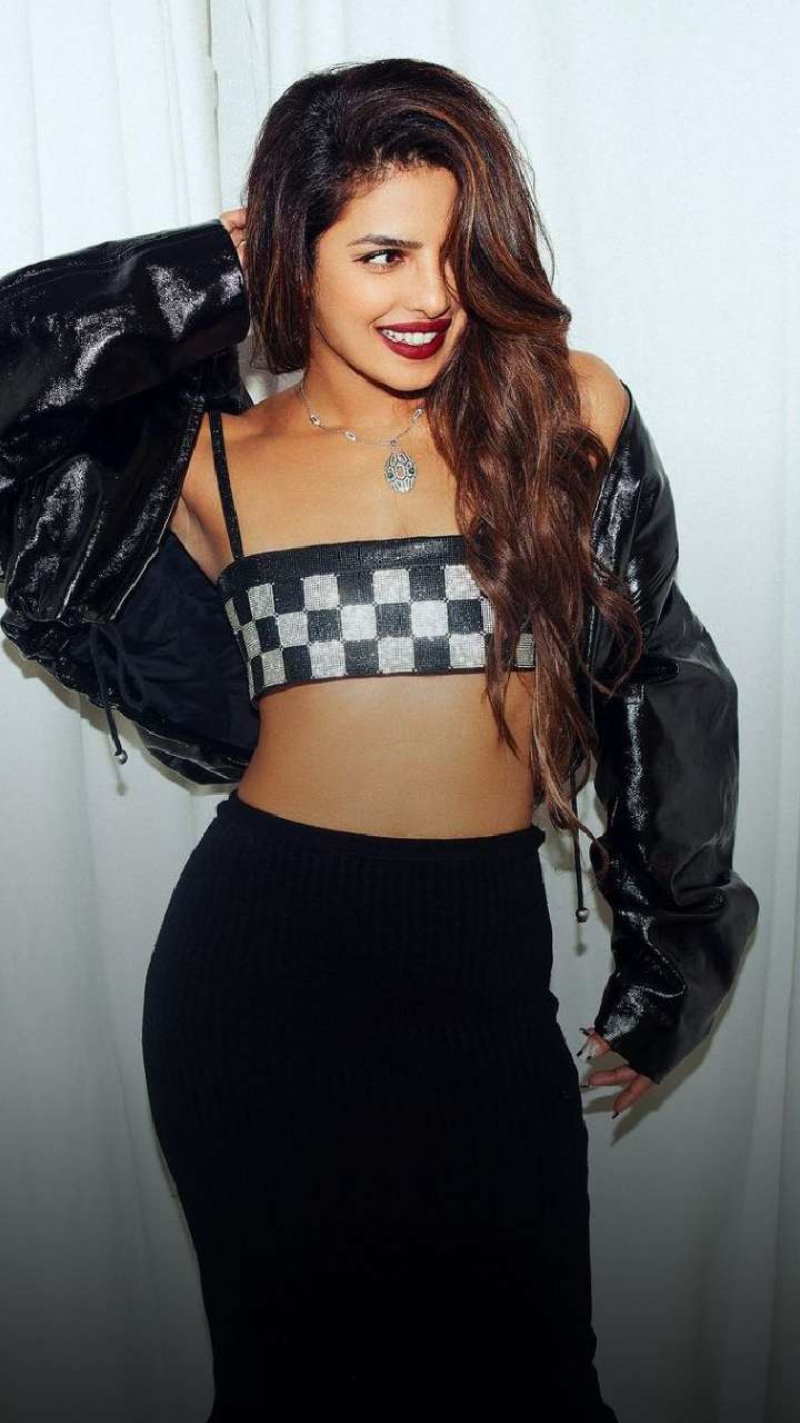 Priyanka oozed oomph as she flaunted her toned figure in this checkered bralette top with a body-hugging skirt and a leather jacket to elevate her overall look.