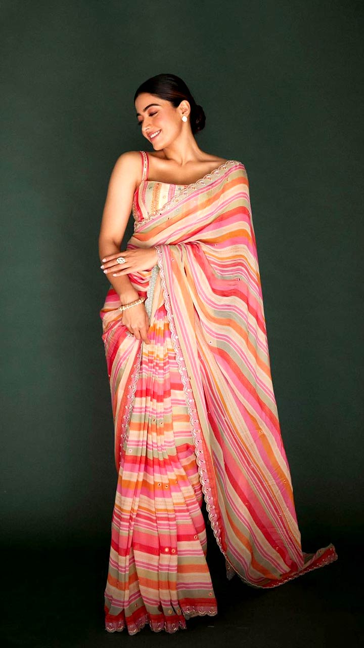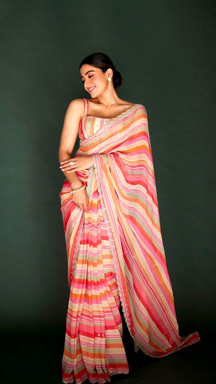 Rashmika Mandanna styled this beautiful printed saree that you can take cues from. She opted for a neat bun and amped up her look with pearl studs.