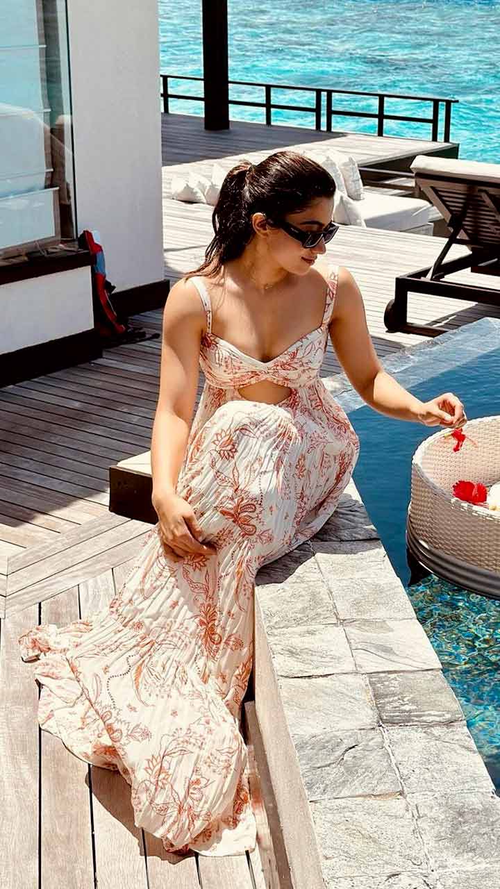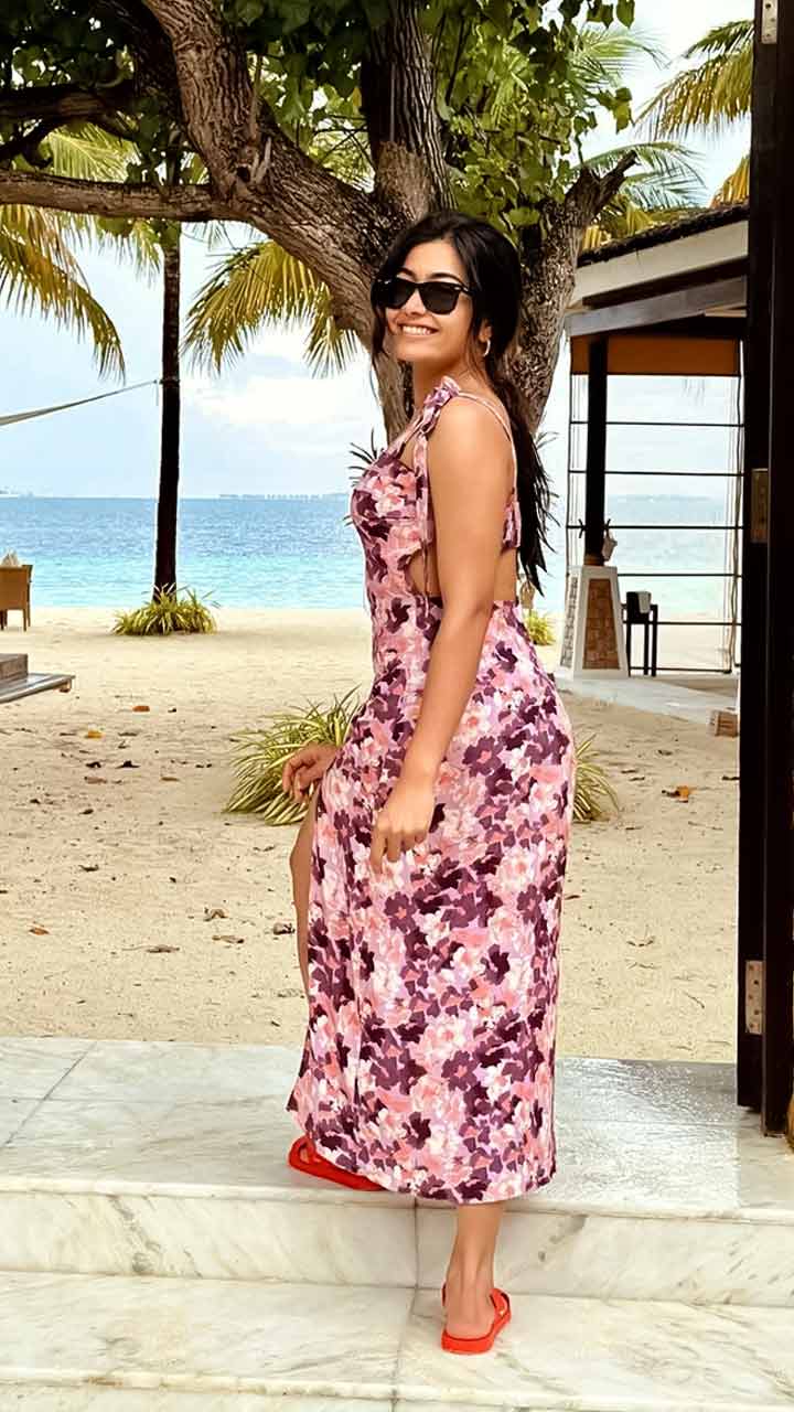While vacationing, Rashmika stunned in a floral-printed dress. It had a plunging neckline and a cut-out around the stomach.