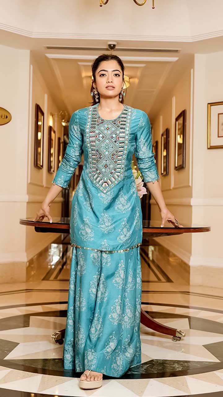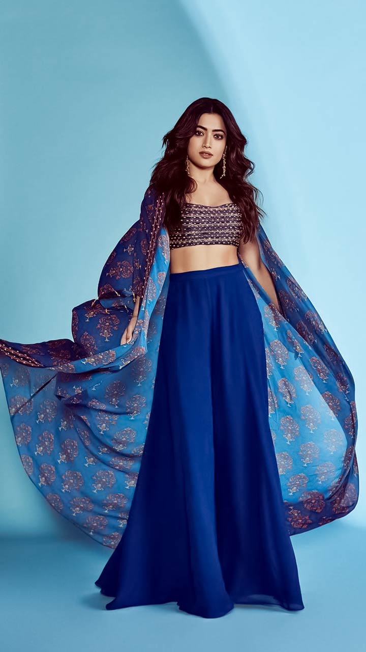 Rashmika elevated her style quotient in this blue Indo-Western outfit. She left her wavy curls open and opted for a smoky eyeshadow.