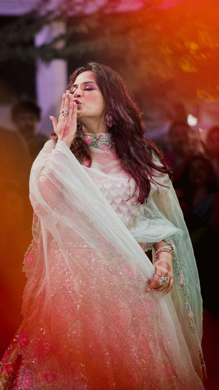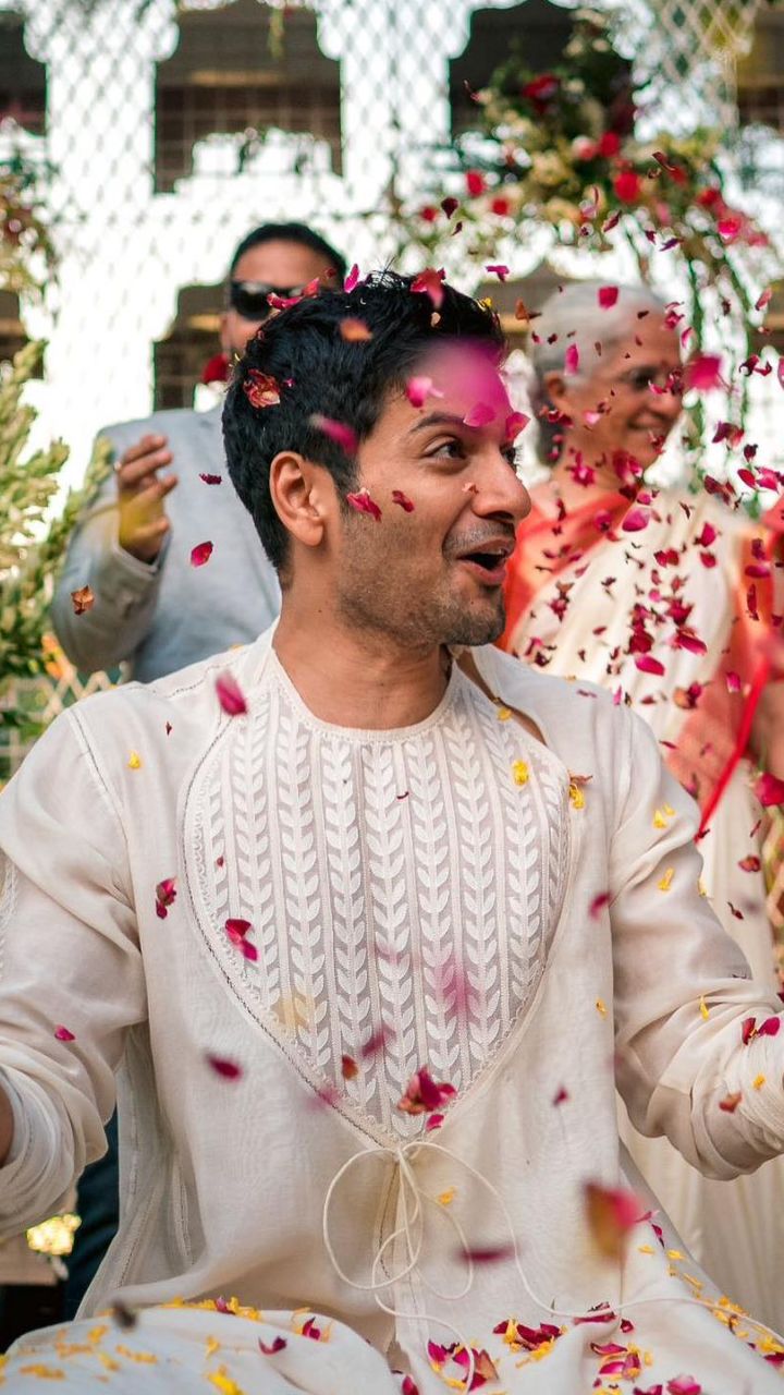 At the mehendi ceremony, the couple was seen playing ‘phoolon ki holi’, where Ali was wearing a graceful ivory angrakha, complementing Chadha’s outfit.