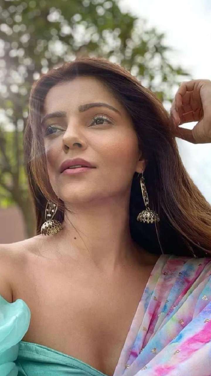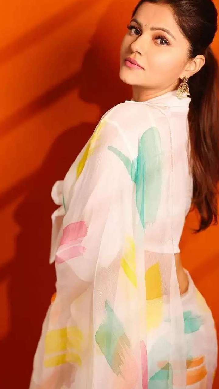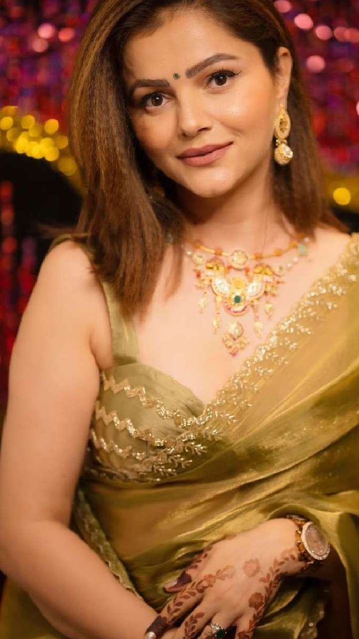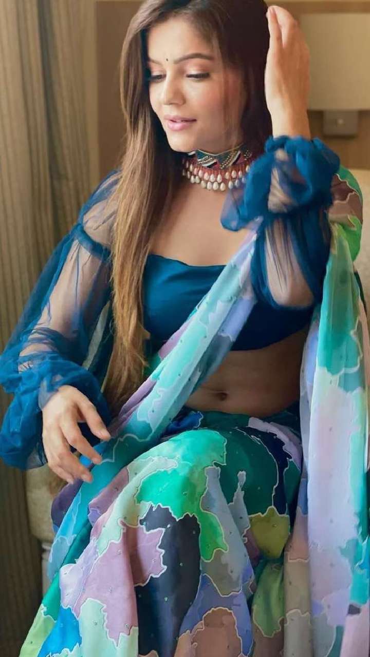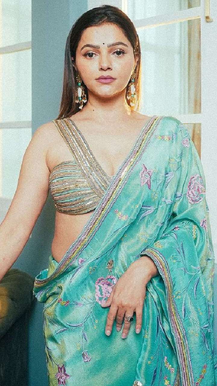 Rubina Dilaik turned up the heat in her traditional saree look. She wore a sleeveless embroidered blouse and accessorised her look with golden jewellery.