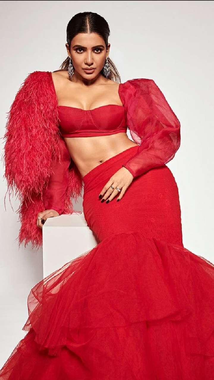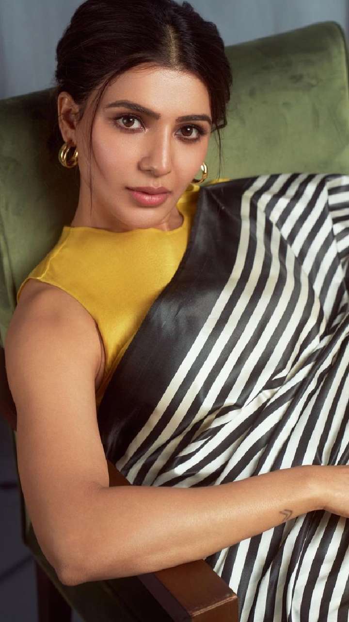 Samantha wore a tricolour saree featuring a black and white striped pattern with a yellow cut-sleeved blouse. She styled her hair in a middle-parted bun hairdo to seal the look.