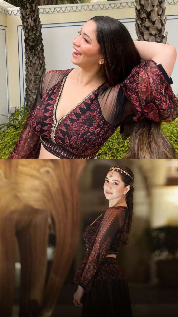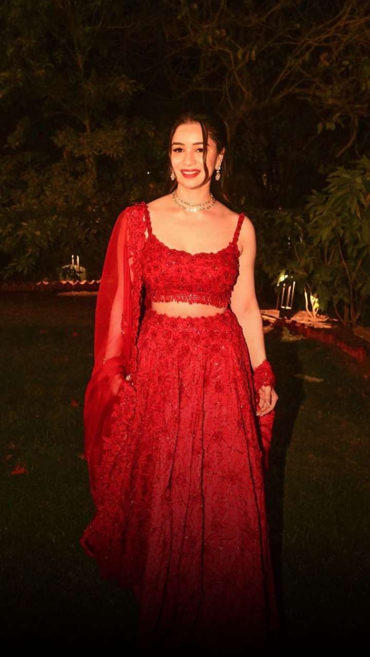 Internet sensation slipped into the indo-western outfit consisting printed crop blouse with sheer detailing and a matching skirt. She accessorised her look with a golden matha patti.