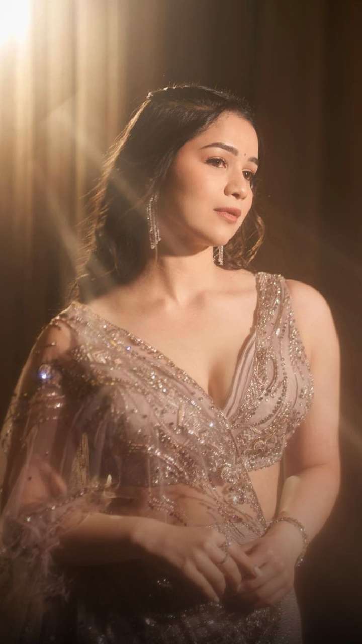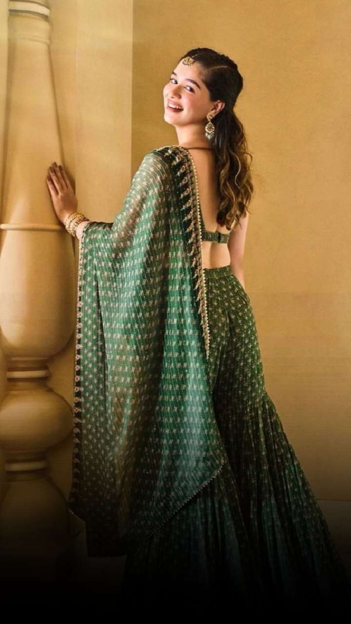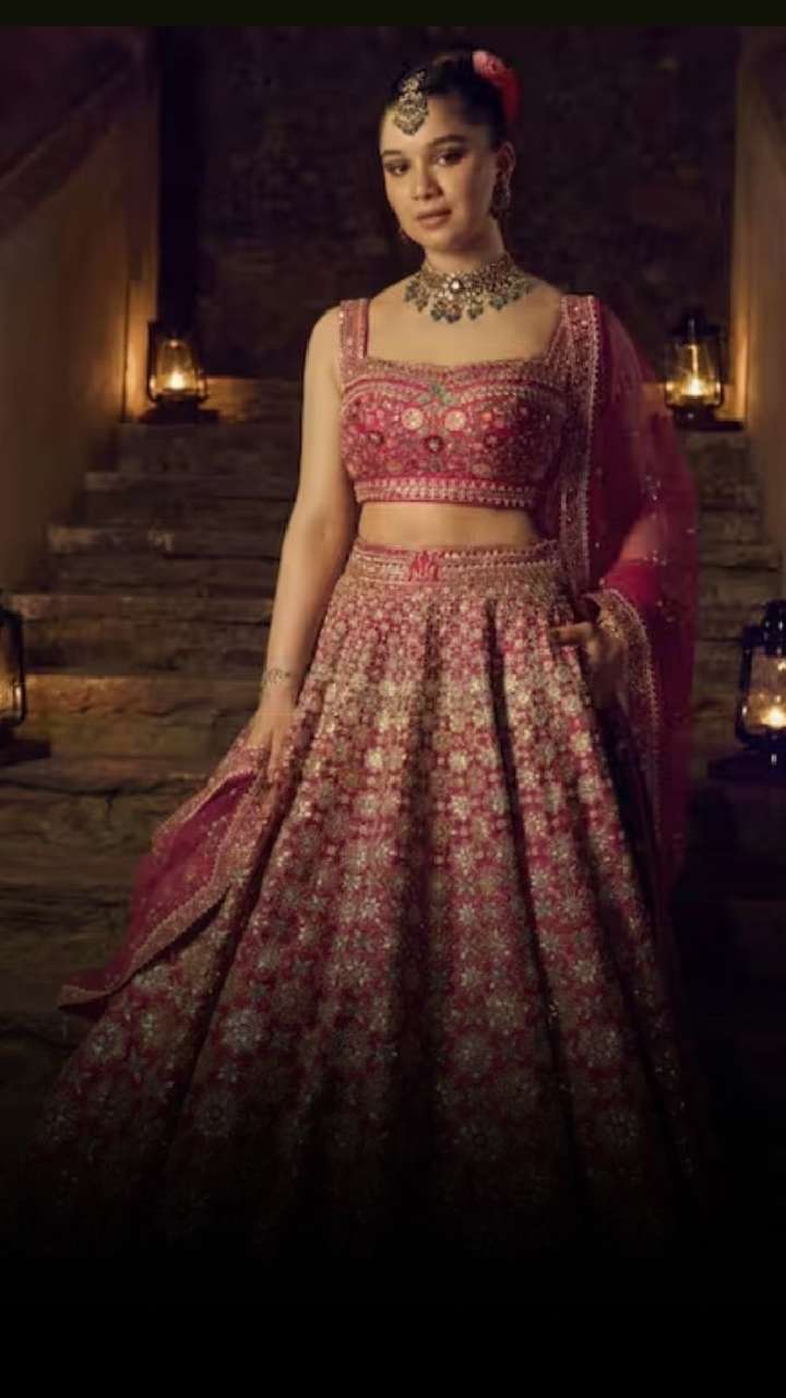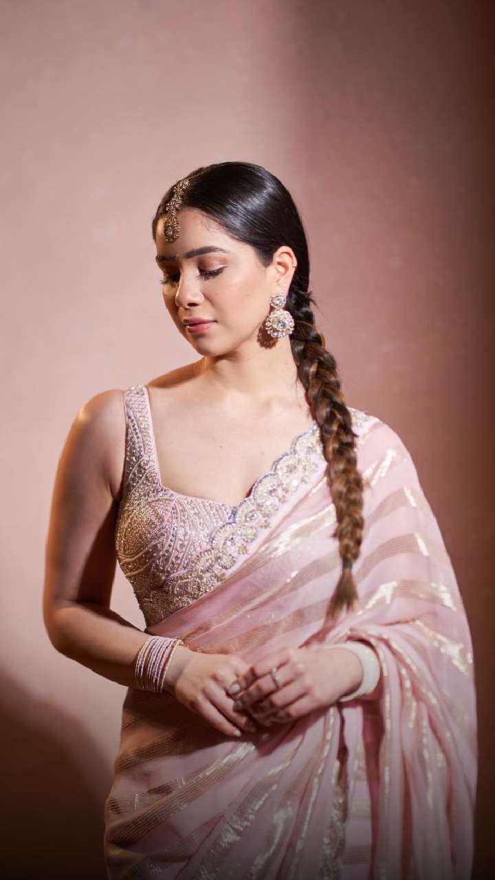 Sachin Tendulkar’s daughter looked drop-dead gorgeous in a pink drape teamed with a cutdana embellished matching square-neck blouse. She accentuated her look with pink blush makeup.