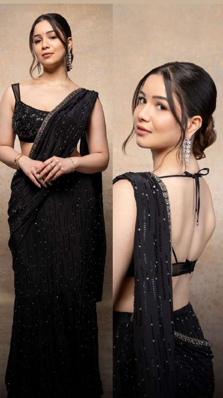 Want to look effortlessly gorgeous? Opt for a diva-approved embellished black drape and a strappy blouse with a plunging neckline and dori detailing in the back.