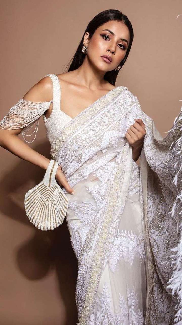 A stylish back-cut-out blouse from Shehnaaz's closet will offer a unique design. Keep your mane straight to elevate the saree look.