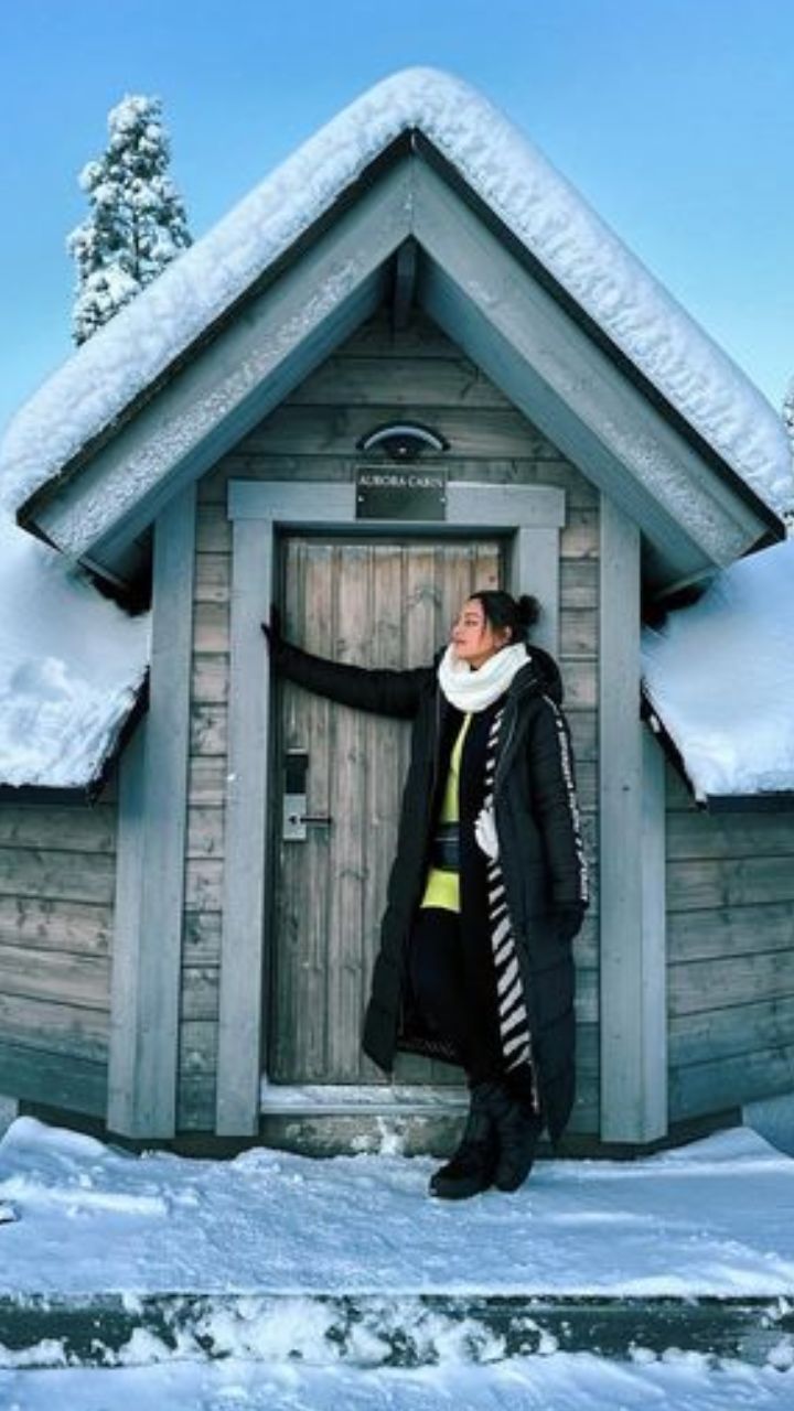 Sinha wore a neon green woollen top with black bottoms and completed the look with a long puffer jacket, a white snood and a fanny pack.