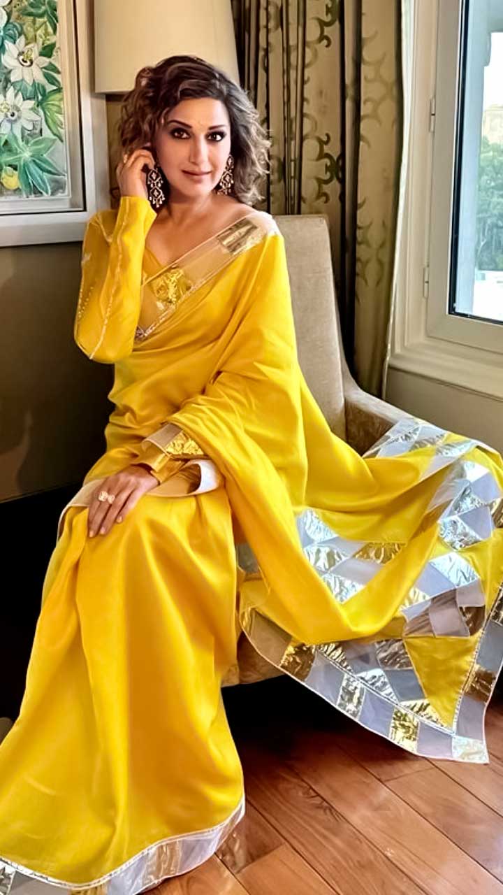 Sonali Bendre's yellow and golden saree looks perfect for a haldi ceremony.