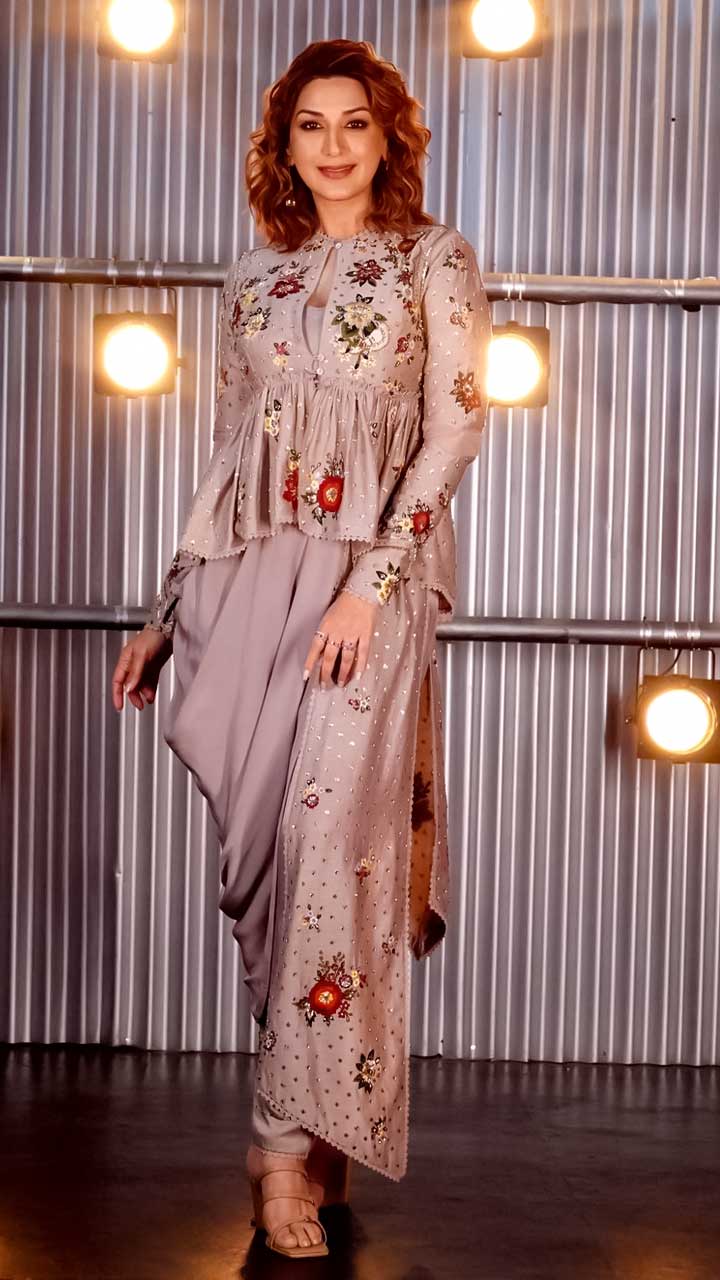 Sonali Bendre looks stunning in this peach floral ethnic attire.