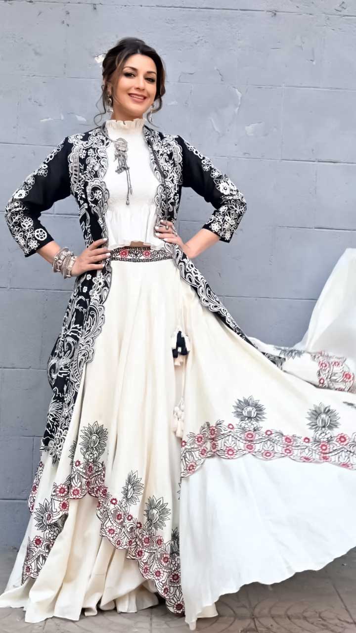 Sonali Bendre looks elegant in this white long embroidered ethnic gown paired with a black embroidered shrug.