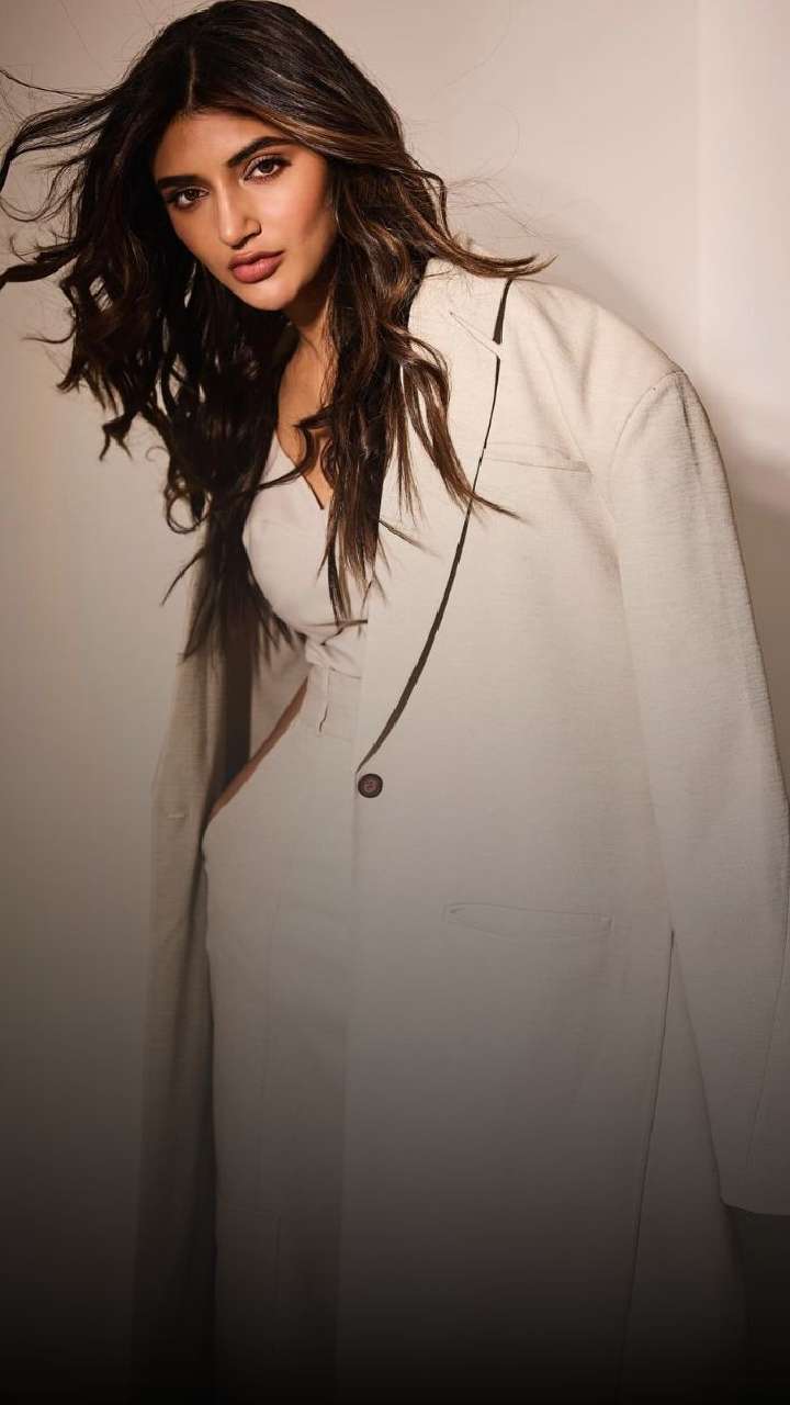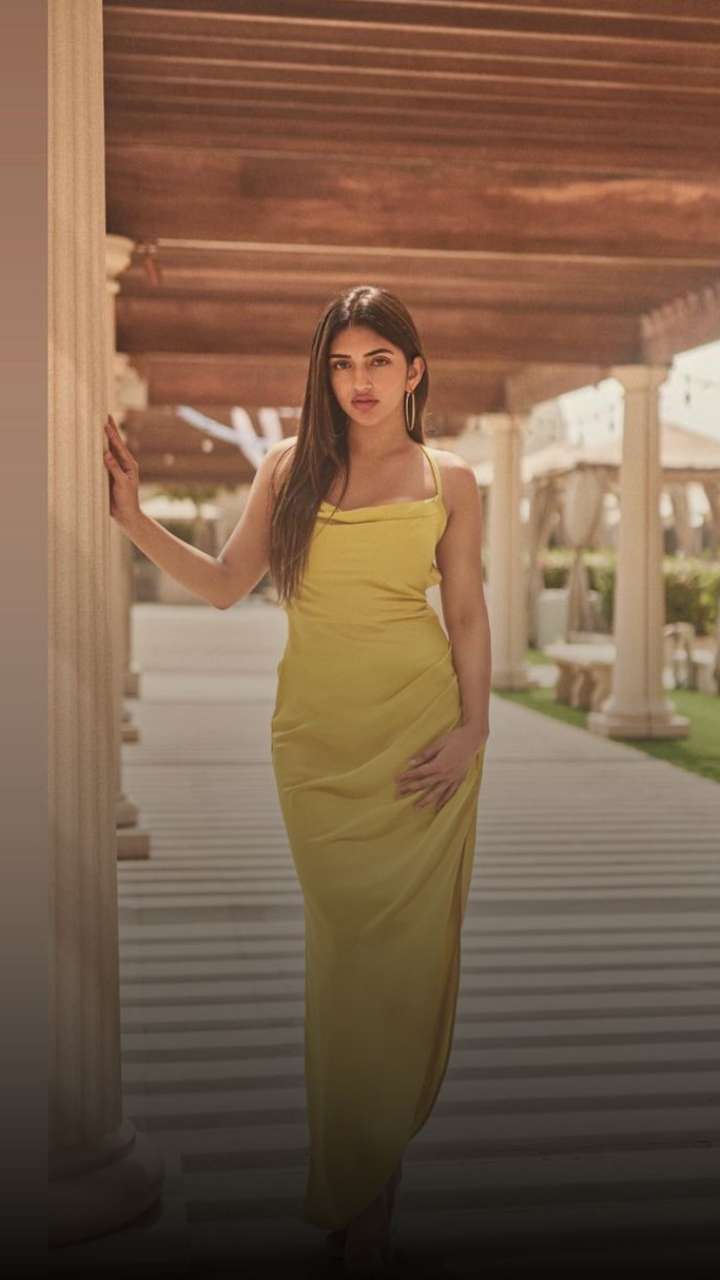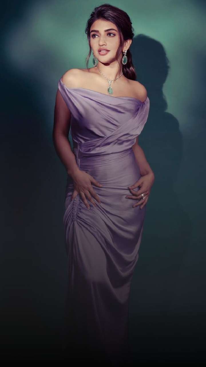 We cannot stop gushing over this stunning dress by Sreeleela. it is perfect for an evening party. Pair it with brown makeup and nude lips to slay.