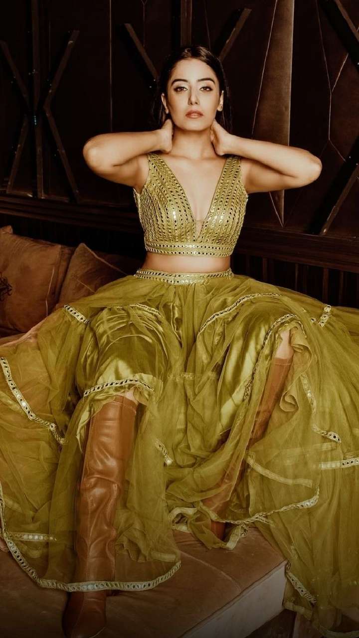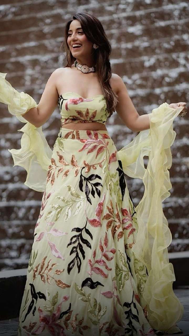 Srishty Rode looked like a vision in a pastel-hued yellow lehenga set with a bustier tube bralette blouse. She accessorised her look with an intricately crafted traditional choker.