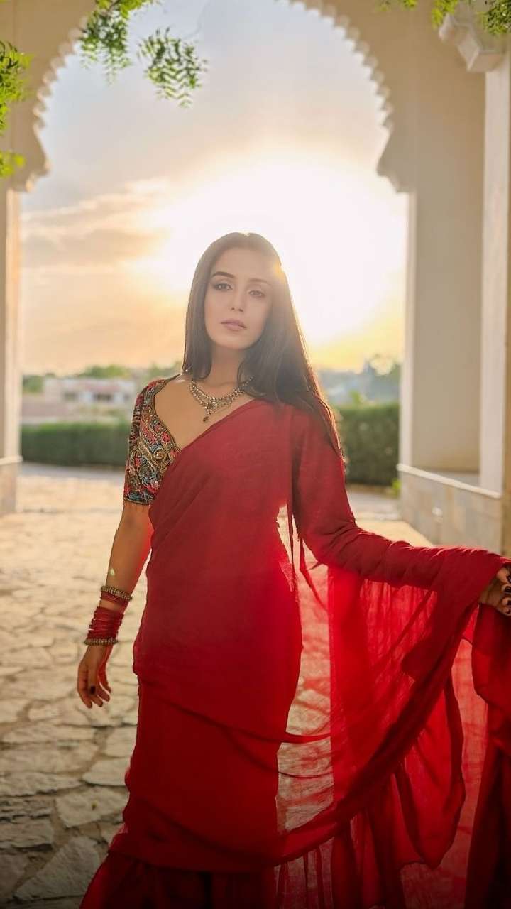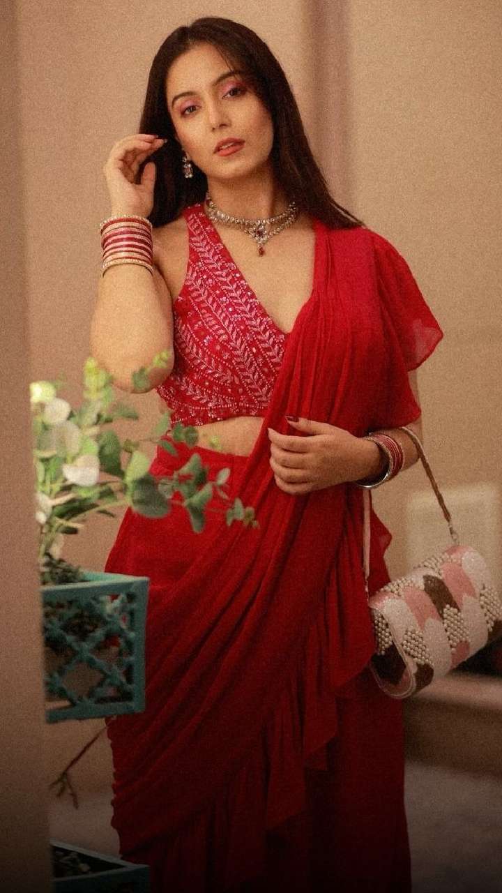 ‘Bigg Boss’ fame actress oozed oomph in a red halter-neck with a criss-cross back blouse. She styled the bold blouse with a lightweight ruffled drape.