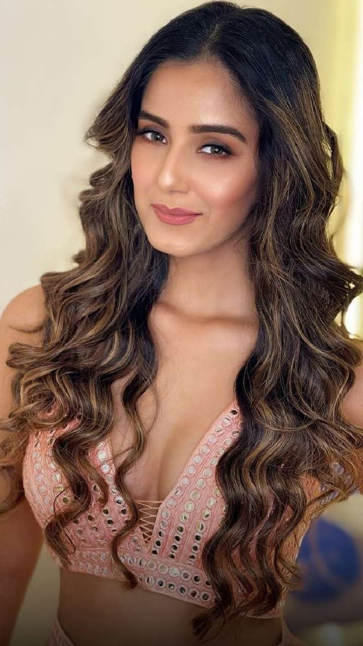 The fashionista exuded charm and chic vibes in a peachy mirror-work, plunging-neckline blouse paired with a matching flared lehenga.