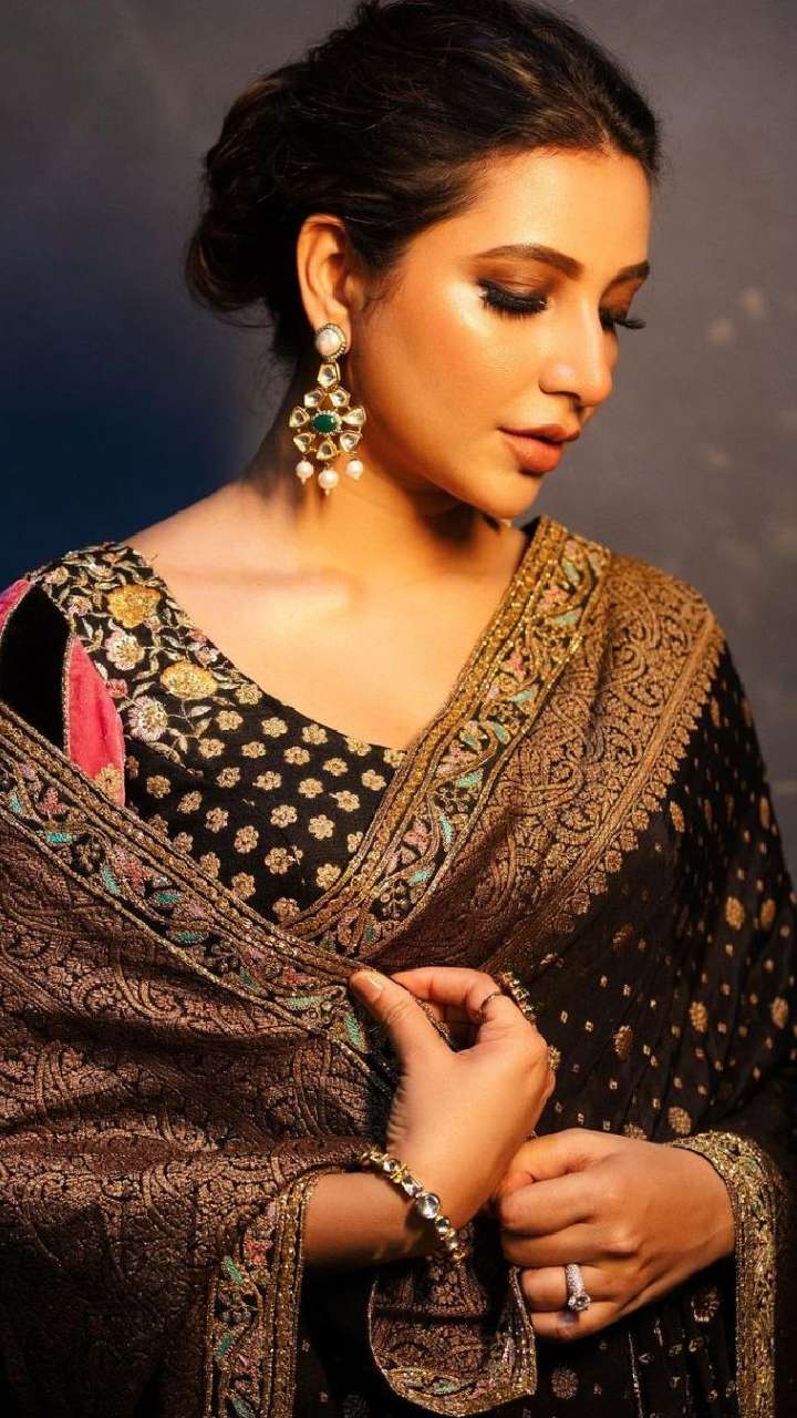 Black never goes out of style. The actor looked gorgeous wearing a black sharara set. The beautiful outfit is made up of floral embroidery. The actor’s ring, earrings and a simple ponytail look took all our hearts.