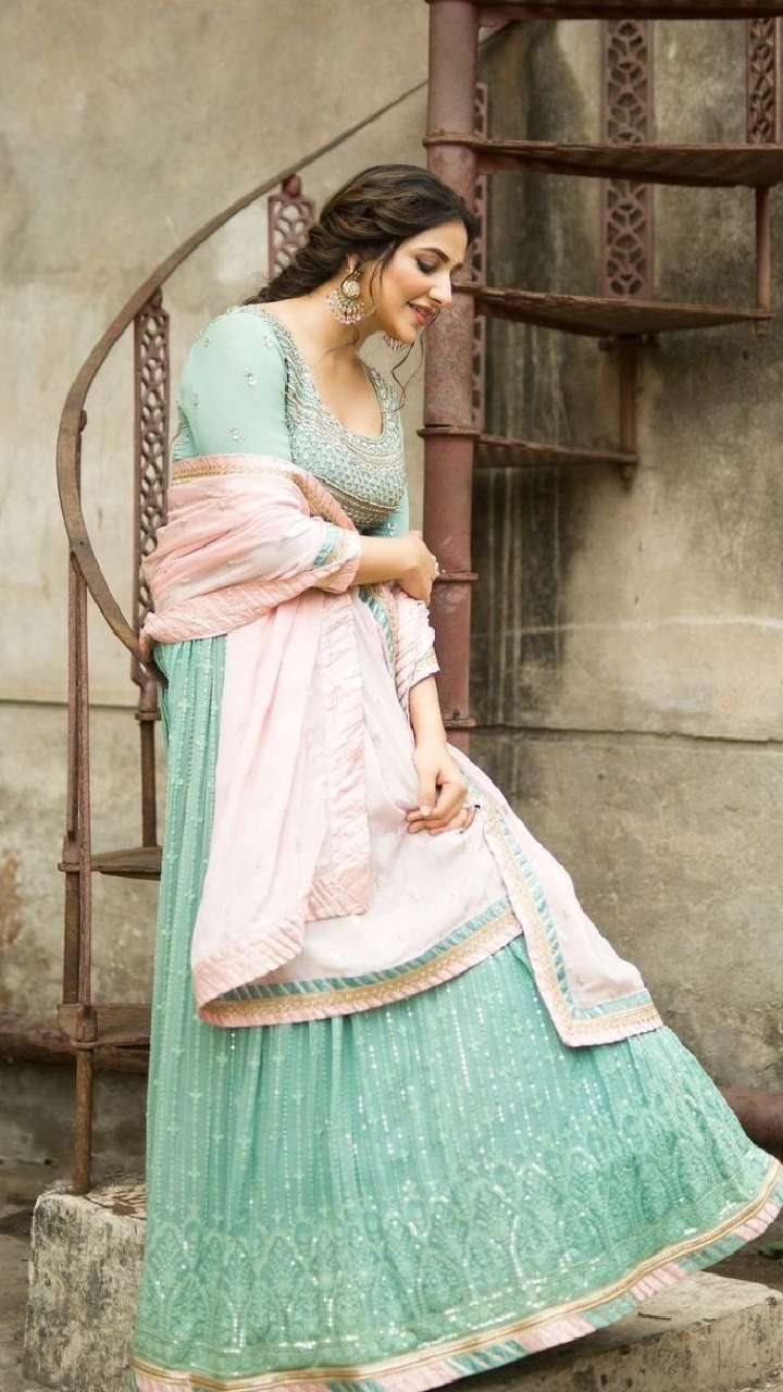 The 'Filmfare Award' holder looked beautiful carrying this Anarkali look with a heavy dupatta and drop earrings. She completed the look with a ponytail and a light pink makeup look.