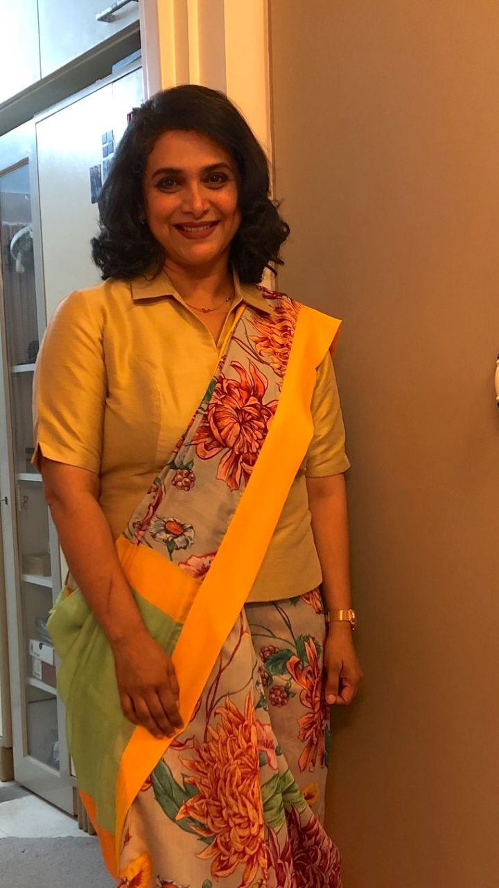 Pilgaonkar donned a floral saree, paired with a shirt blouse.