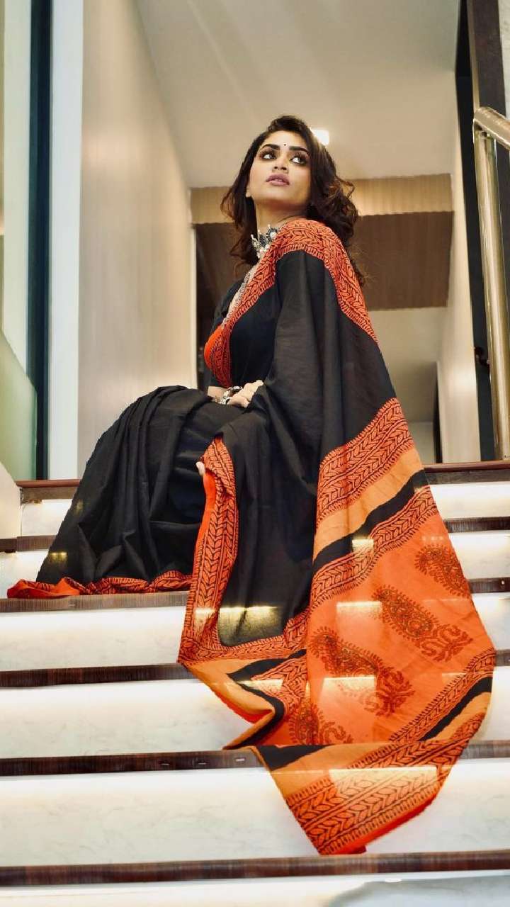 Narayanan looked gorgeous in this black saree featuring an orange border.