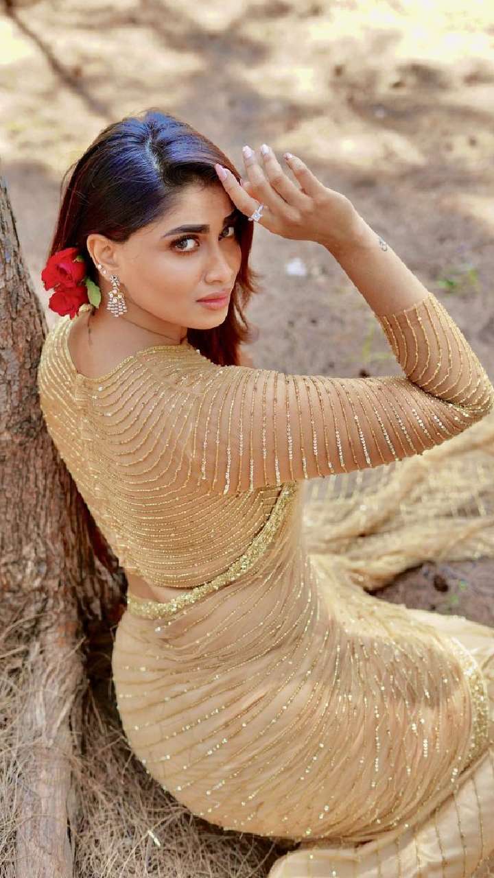 Shivani looked radiant in a golden semi-sheer saree with embellishments.