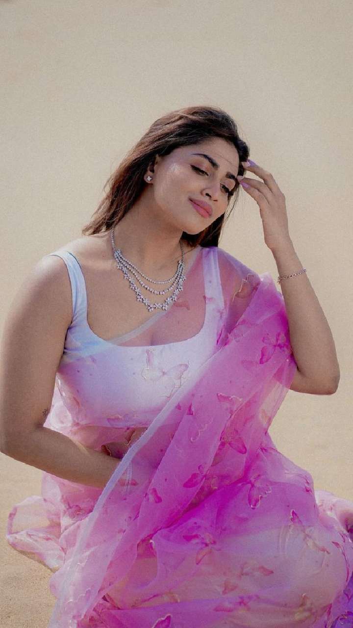The actor donned a pink floral saree featuring intricate golden detailing and a sleeveless blouse.