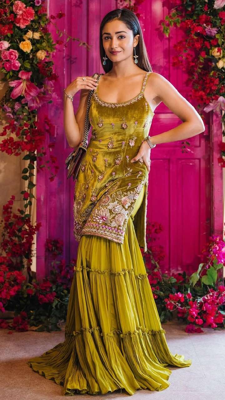 Want to make a bold fashion statement? Opt for diva-approved embroidered velvet sharara suit, which will add a touch of royalty and style to your desi wardrobe.