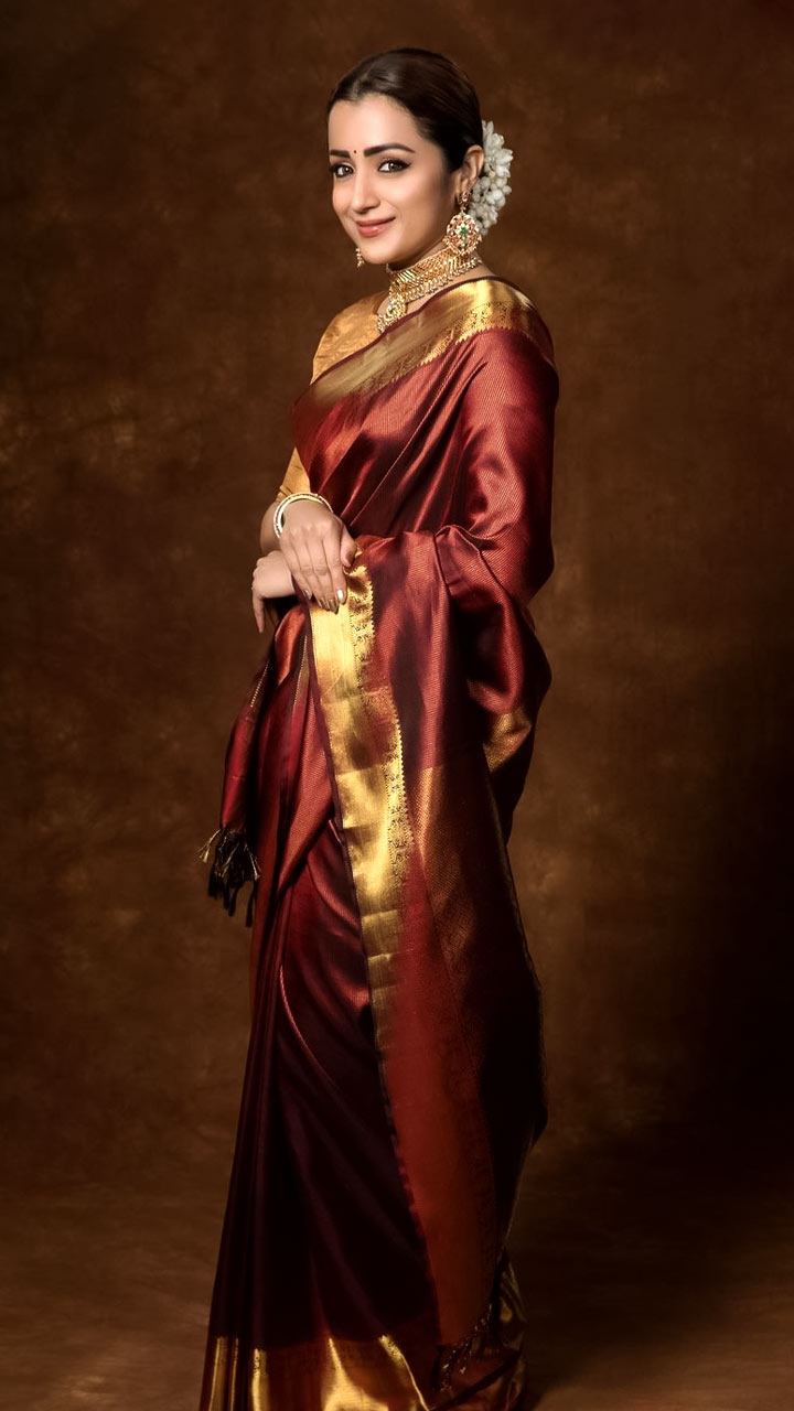 If you want to go all traditional for a wedding festivity, you can don a silk saree like Trisha Krishnan. She accessorised it with gold jewellery and decorated her bun with a gajra.