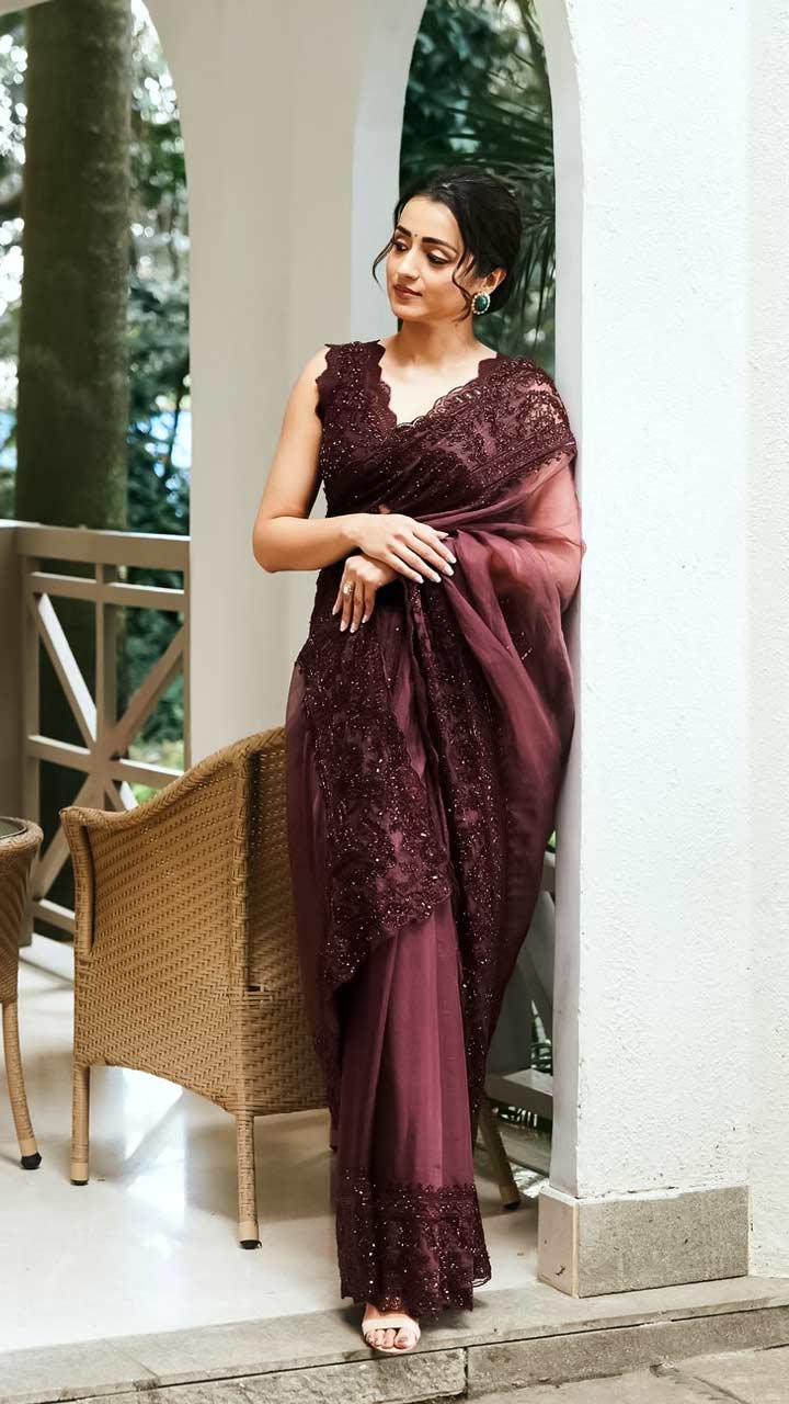 In this image, the actor was wearing a wine-coloured saree featuring intricate embroidery work. She styled her hair in a centre-parted rose bun and wore studs.