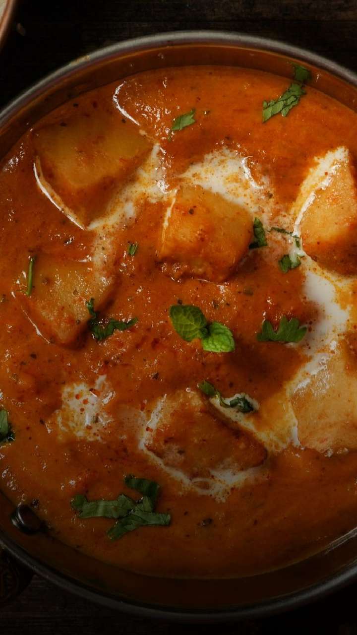 A flavourful potato curry cooked with aromatic spices and yoghurt embodies the essence of Kashmiri cuisine.