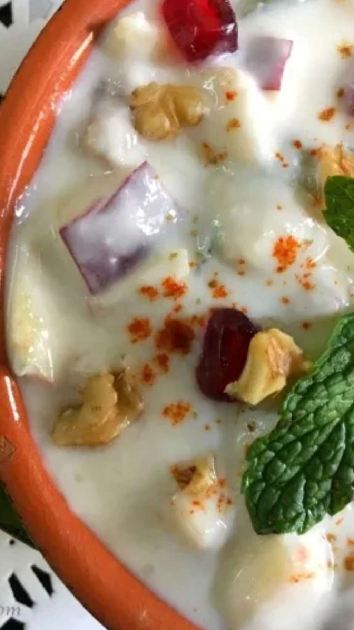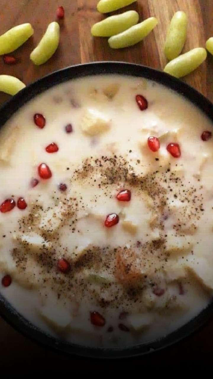 It is a mixture of black pepper, fruits, jeera and black salt. This raita is mouth-watering yet healthy to add to a meal.