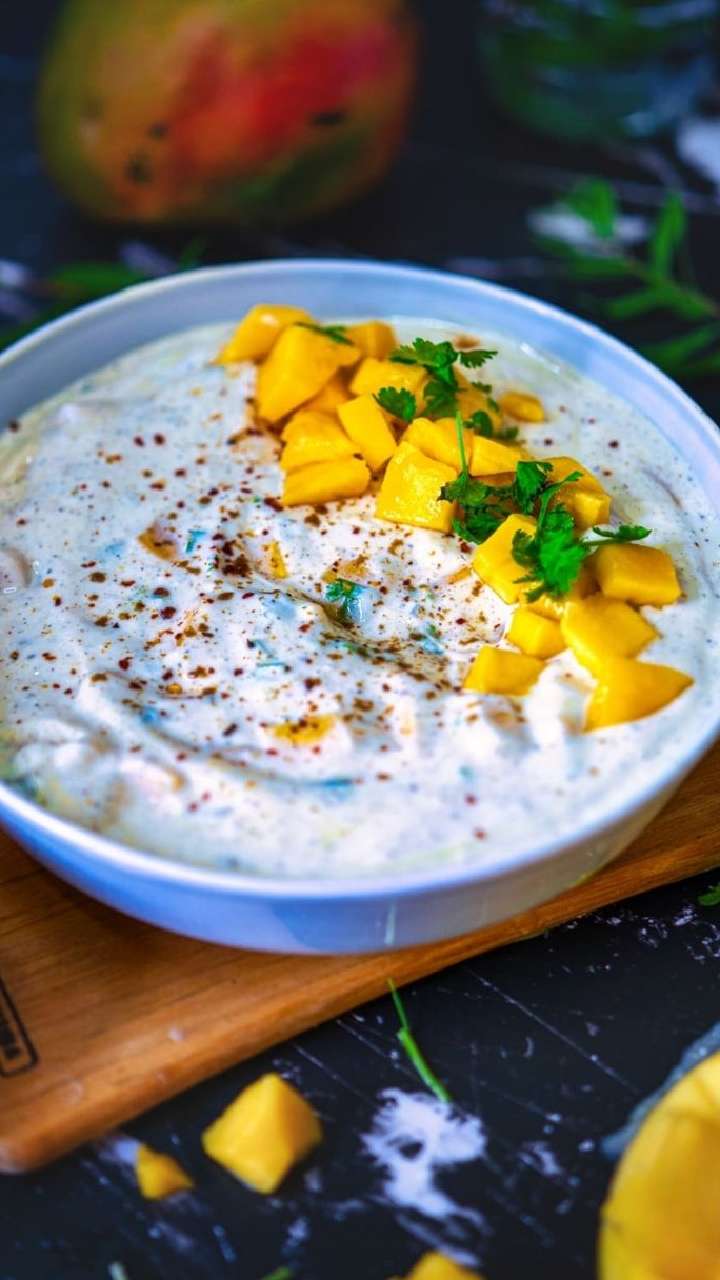 Mango raita is a must-try for all mango lovers out there. To make it, simply stir curd until smooth, then add mango and sliced almonds.